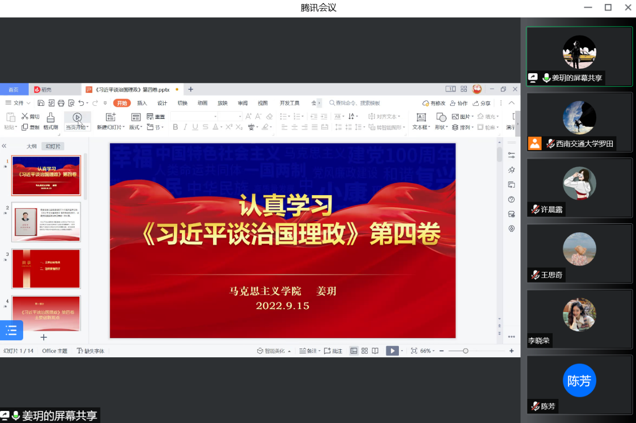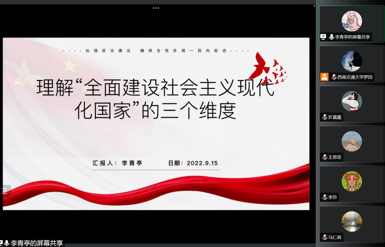 2022年9月15日下午,2020级硕士研究生党支部召开线上组织生活会,按照既定组织生活会学习分组名单,聆听了李青亭、姜玥、陈芳三位同志关于学习习近平新时代中国特色社会主义思想的心得体会。本次会议由党支部书记罗田同志主持,支部全体党员参加。