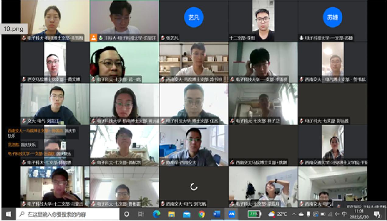 2022年9月30日,在喜迎祖国母亲73周年华诞和党的二十大召开之际,公司博士党支部同本校电气工程公司2022级博士党支部、电子科技大学机电公司博士党支部、硕士七、十二支部以及电子科技大学物理公司研究生一支部共6个支部,共计234人,在上午10时开展了线上支部联建活动,活动由电子科技大学机电公司博士党支部书记范昊洋主持。首先,范昊洋同志向与会党员简要介绍了今年9月以来的新政策,旨在带领大家快速了解时下新政,提升党员同志理论认知和政策风向感知度。
