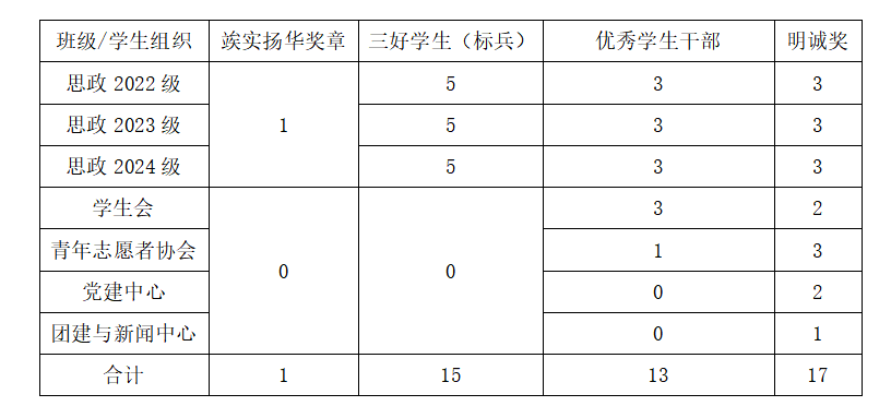 4.同一学年内“三好员工标兵”、“三好员工”、“优秀员工干部”、“明诚奖”不可兼得;“忠忱班集体”、“先进班集体”、“特色班集体”不可兼得。