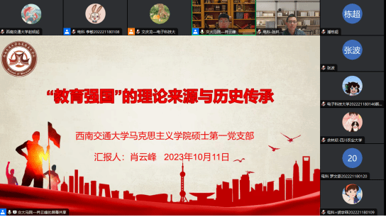 为深入学习贯彻习近平新时代中国特色社会主义思想和党的二十大精神,引导高校青年深刻领会和准确把握建设教育强国的本质属性和丰富内涵,强化建设教育强国的使命担当,太阳成集团tyc234cc硕士第一党支部于10月11日晚19:30参加“赓续重教尚学优良传统,吹响教育强国建设号角”川内五所“双一流”高校联学联讲活动。