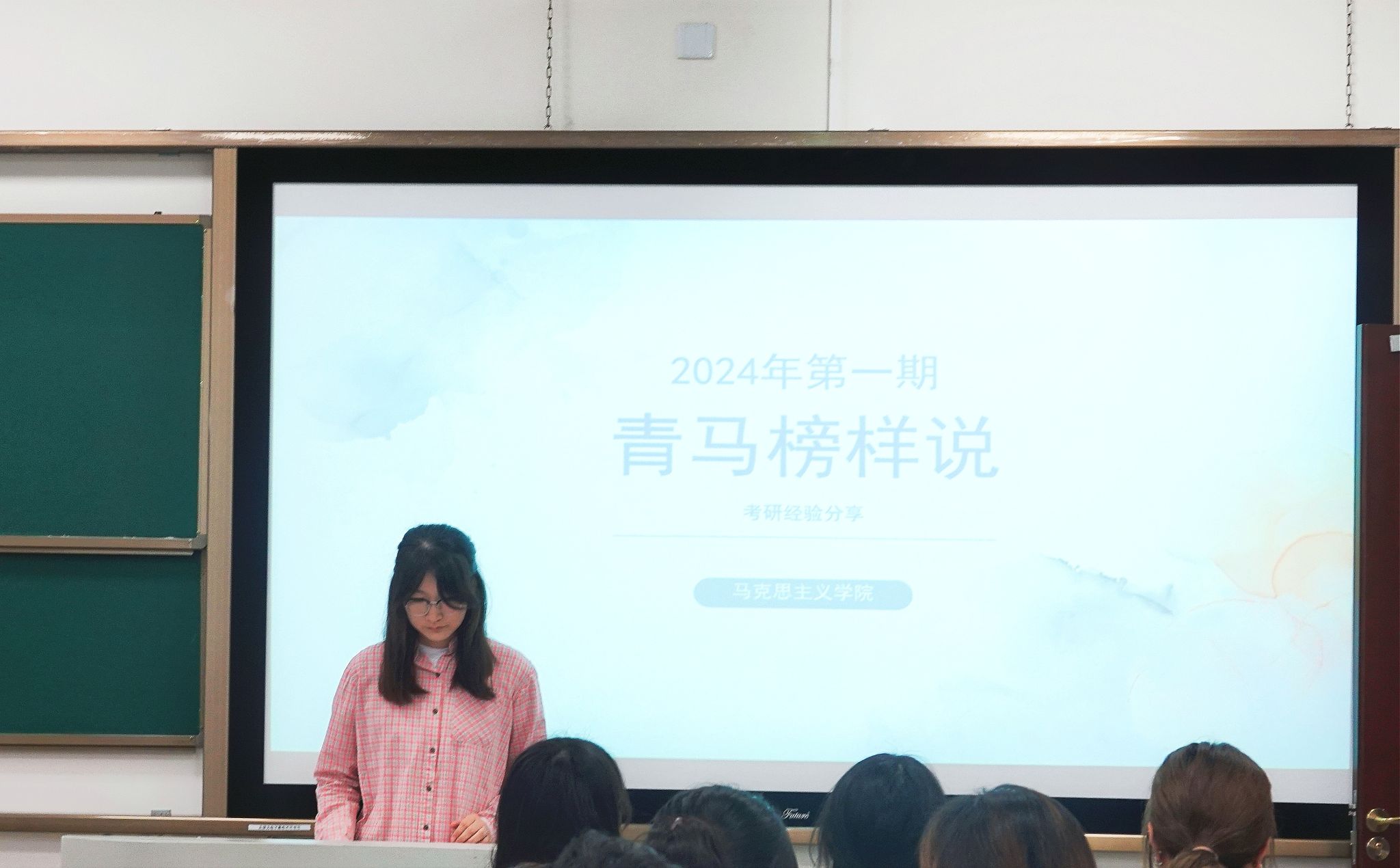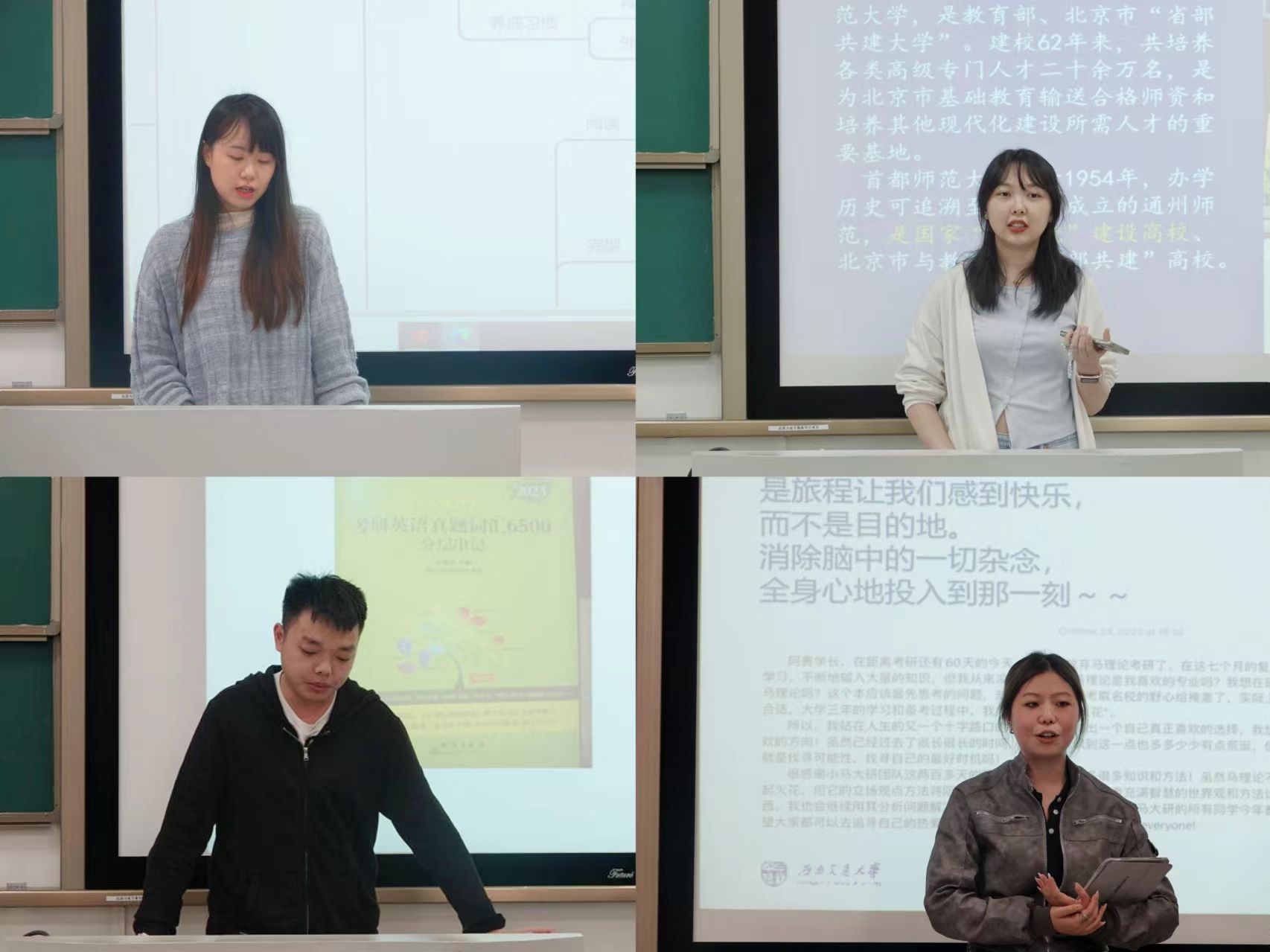 独行者步疾,结伴者行远。为了助力同学们更好地掌握复习方法,为意向考研的同学搭建交流学习的平台,积极发挥优秀学长学姐的榜样作用,汲取榜样力量,4月18日15:30太阳成集团tyc234cc在X30609举办了2024年“青马榜样说:考研择校与复习经验分享”活动,本次活动邀请了在2024年考研中取得优异成绩的左珈弋、马祎涵、赵鹏、古璨四位同学作为分享嘉宾。学公司党委副书记邓秀芸,本科生辅导员杜晓林、赵子涵出席此次活动,大三同学共同参与。