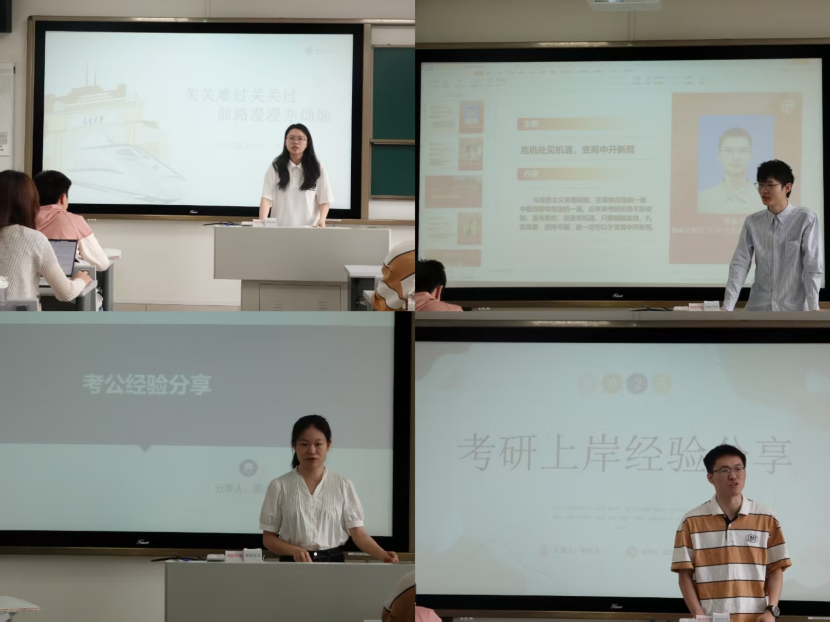 陈煦雅以“关关难过关关过,前路漫漫亦灿灿”为主题,深入剖析了成功保研的破题之道。她着重强调良好心态的重要性,告诉同学们焦虑最好的解药是行动,与其焦虑结果不如专注当下。龚振中分享了他的思维训练秘籍,建议同学们将3月至6月设定为“理论筑基期”,通过系统研读原著,培育马克思主义理论思维。廖伟杰建议同学们将每日划分为四个学习时段,在复习时动静相济,每周安排固定运动时间释放压力。周小茹同学以“公务员备考全流程精析”为主题,拆解公务员考试制胜密码,通过绘制招考流程图解,清晰呈现报名、笔试、面试等关键环节,为在场学子打开备考新思路。