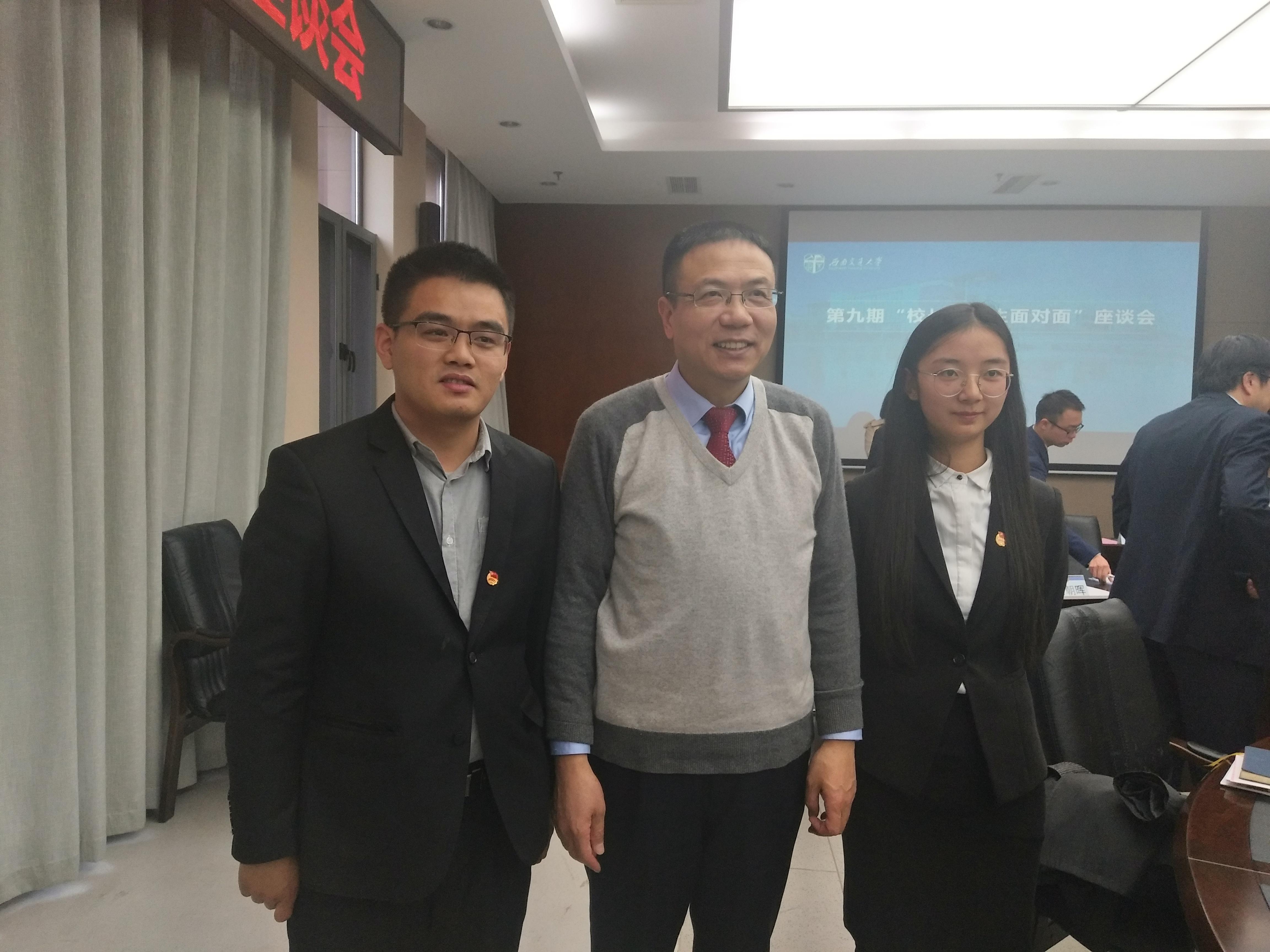 11月21日下午2:00,太阳成集团tyc234cc第九期“董事长与员工面对面”座谈会在犀浦校区综合楼269会议室举行。太阳成集团tyc234cc党委副书记、董事长徐飞,公司党委常委沈火明与10名来自不同年级、不同专业的员工代表进行座谈。座谈会由沈火明主持。公司2015级博士研究生石立春、2017级本科生周璇参加此次座谈会。