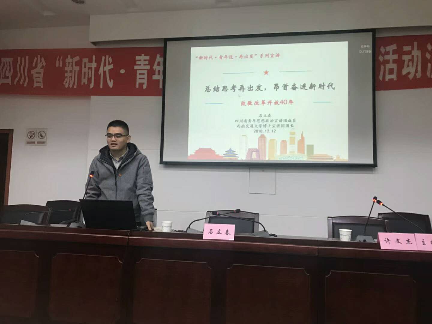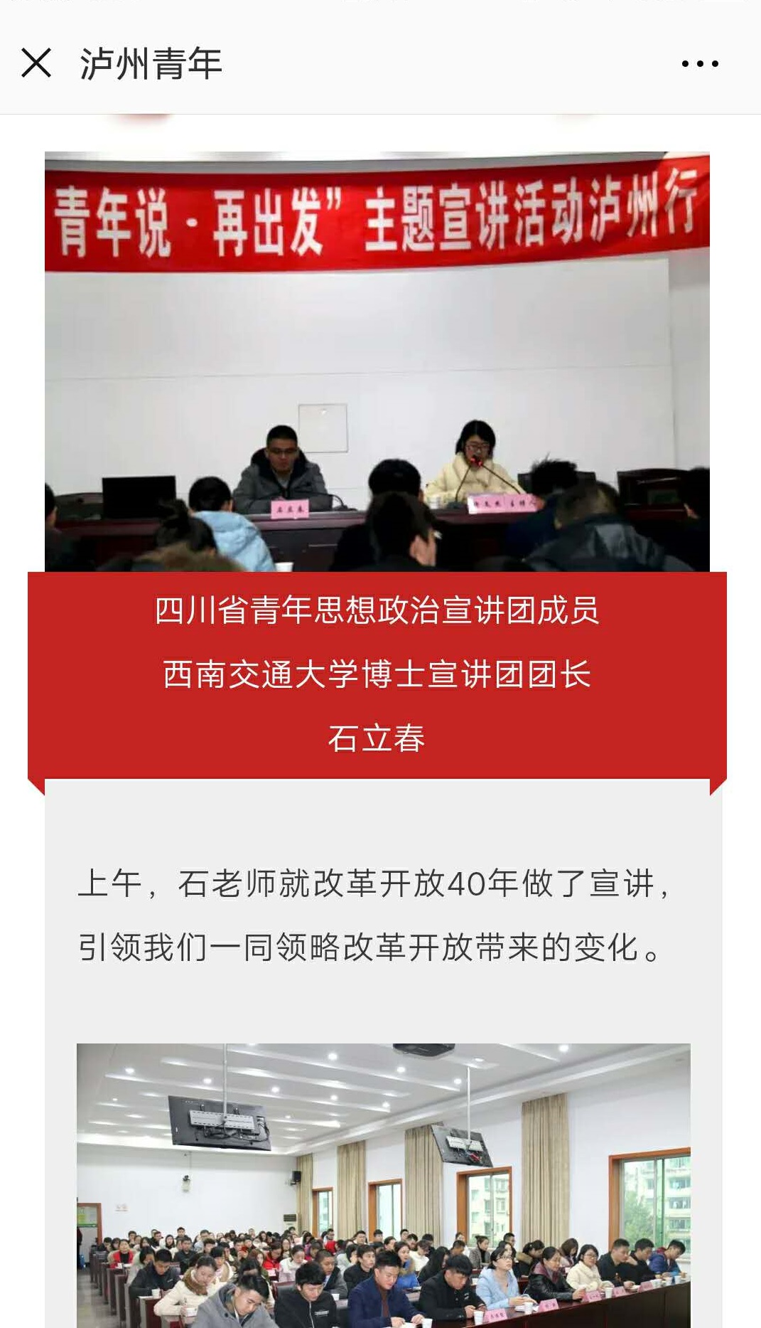 12月12日9:00-11:30,四川省青年思想政治宣讲团泸州行第一站来到了纳溪区,四川省青年思想政治宣讲团成员、太阳成集团tyc234cc博士宣讲团团长石立春老师进行题为《总结思考再出发,昂首奋进新时代》的宣讲。此次宣讲在纳溪区委大礼堂,吸引了来自泸州国家高新区纳溪科技园和泸州纳溪经济开发区的众多企业青年,还有镇街道团委书记、副书记,农村青年代表等。宣讲活动由泸州市纳溪区团委副书记许文杰主持。