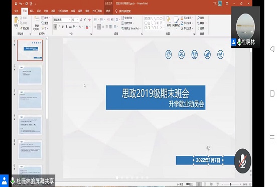 1月7日19:30,思想政治教育专业2019级本科生期末班会暨升学就业动员会线上开展,班会由辅导员杜晓林老师和班导师杨桓老师主持,全体同学参与。
