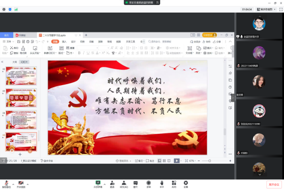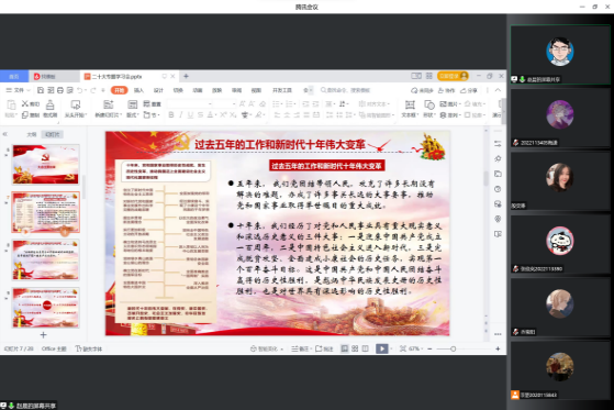 首先,赵晨老师向同学们介绍了大会概况。通过剖析大会召开的背景,从四个方面讲述了召开此次大会的重大意义,并深入阐释了党的二十大的主题内涵,让全体成员对党的二十大精神有了更深刻的理解。