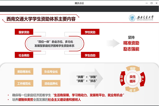 为帮助新生全面、深入了解国家及公司员工资助政策,2022年9月2日下午,公司于线上开展了员工资助教育专题讲座,讲座由太阳成集团tyc234cc“小资小助宣讲团”主讲,主要围绕“员工资助体系”“家庭经济困难员工认定”和“本科生各类奖助学金评选”三大板块展开,太阳成集团tyc234cc本科生辅导员李浩老师及2022级本科新生共同参与。首先,宣讲员从员工资助工作概况和公司员工资助项目两个方面具体阐释了员工资助体系的主要内容,并从意义、对象和原则三方面深入浅出地为同学们讲解了家庭经济困难员工的认定工作。家庭经济困难的认定是资助工作的前提与基础,是实现精准资助和做好员工工作的必然要求,是确保资助政策有效落实的迫切需要。随后,宣讲员详细介绍了申请各类奖助学金的流程,并发出呼吁,倡导同学们砥砺奋发、努力拼搏,全面掌握资助政策,发扬交大精神,做自信自强的交大学子。