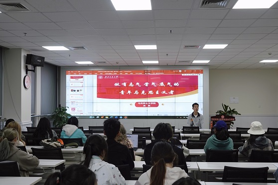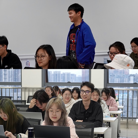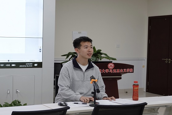 比起一场经验分享会,这更像是一场自然而亲切的交谈会。吴昊以“两问”开启与同学们的对话,在提及为什么来到马院时,转专业到公司的王筠然同学这样回答:“我提前了解了马院的一些信息,发现我对马院的课程比较感兴趣,而且语言对我来说更多的是一种学习的工具,于是便有了换专业这个念头。”在放松的问答互动之中,本次活动沙龙的氛围也渐渐轻松活跃起来。