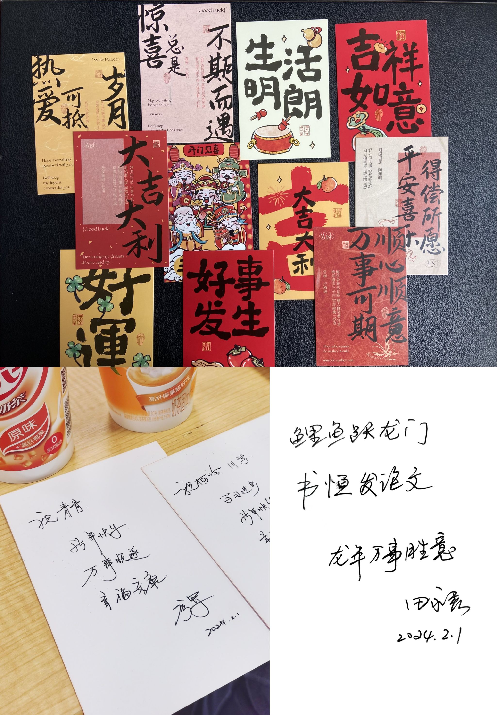 为营造温馨喜庆的新春氛围,公司为参加座谈会的同学们提前准备了新年大礼包,包含坚果、贺卡和图书。座谈会上,廖军、田永秀在贺卡上为每位参会同学写上新春祝福,送出美好祝愿。公司还为留校同学准备了春联、福字、生肖挂件等传统装饰品,供同学们装点寝室,感受浓浓的新春氛围。参会同学们纷纷表示,这样的交流会很有意义,公司的慰问和老师们的祝福非常暖心!超赞!