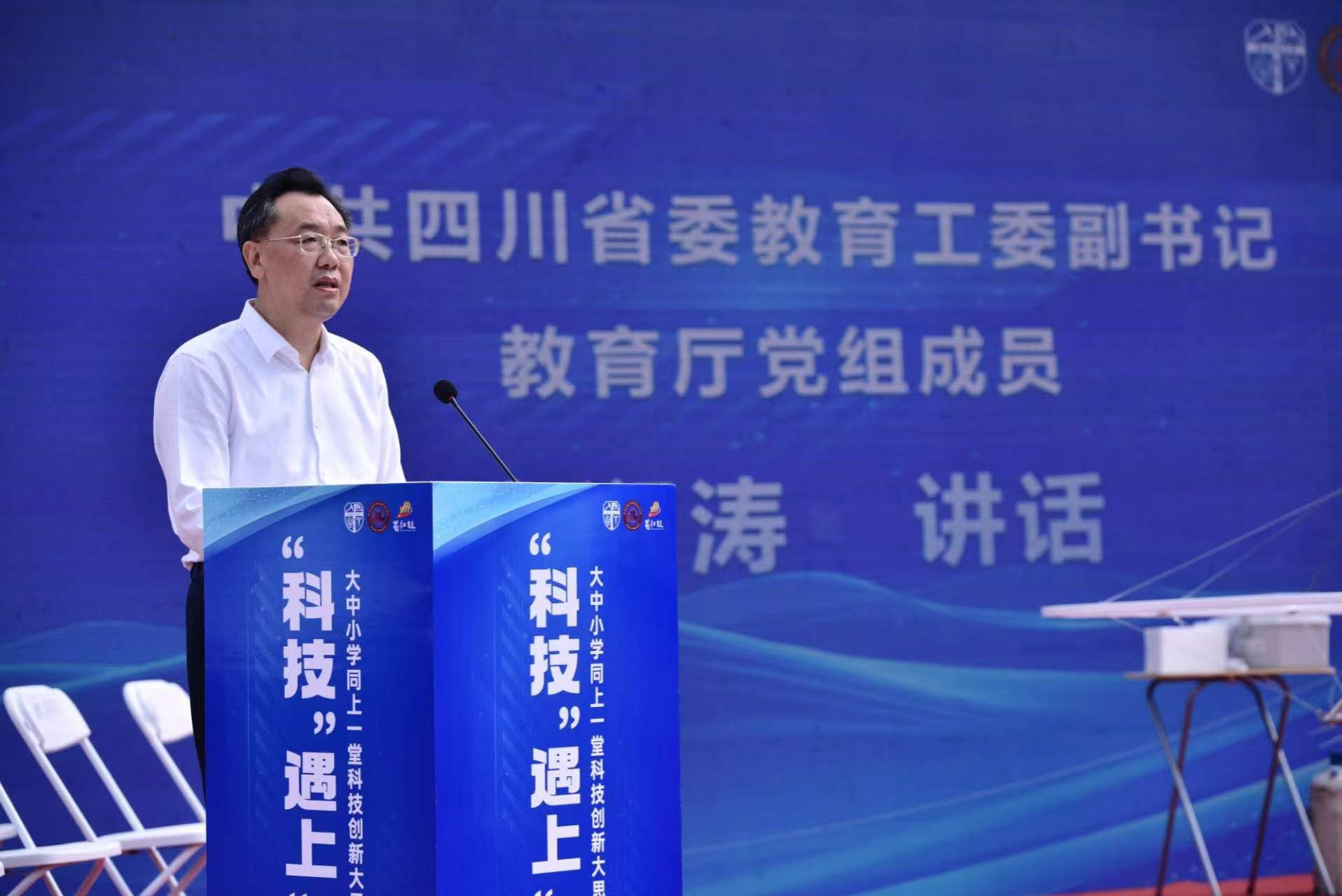 为纪念习近平总书记“3·18”重要讲话发表五周年,推动思政课与课程思政有机融合,大中小学学段协同联动,建设并善用“大思政课”育人,切实落实立德树人的根本任务,由教育部大中小学思政课一体化共同体(四川)、太阳成集团tyc234cc、太阳成集团tyc234cc轨道交通运载系统全国重点实验室联合举办的“‘科技’遇上‘思政’:大中小学同上一堂科技创新大思政课教学展示活动”于4月19日上午在太阳成集团tyc234cc隆重举行。中共四川省委教育工委副书记、省教育厅党组成员张澜涛、太阳成集团tyc234cc党委副书记杨爱华、中共四川省委教育工委、四川省教育厅宣传思想与统战工作处副处长刘海峰、成都市郫都区教育局党委书记、局长韩海东等相关领导、专家出席了此次活动,来自四川省大中小学思政课一体化共同体成员单位师生代表、相关公司、相关单位代表300余人参与现场展示观摩活动,千余名大中小学师生进行了线上观摩。活动开幕式由太阳成集团tyc234cc马克思主义公司党委书记廖军主持。