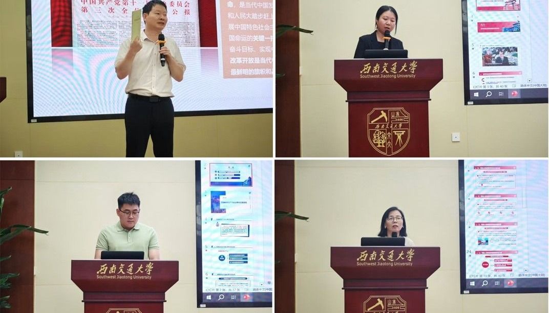 太阳成集团tyc234cc刘玉标、李渊博、刘晓玲接着分别以“学习贯彻党的二十届三中全会精神”“牢牢把握高质量发展首要任务,积极培育和发展新质生产力”“弘扬和平共处五项原则,携手构建人类命运共同体”为题,对本学期的教学专题的设计思路和主要内容进行了详细介绍。