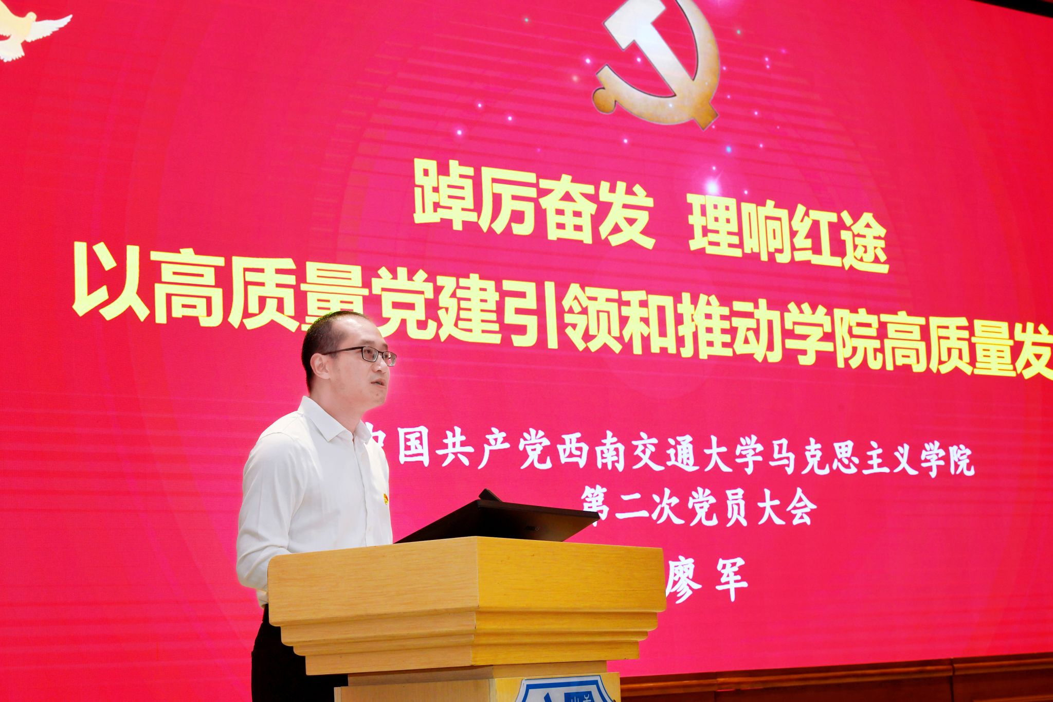廖军同志代表公司党委作上届工作报告。报告以“踔厉奋发 理响红途 以高质量党建引领和推动公司高质量发展”为题,总结并回顾了第一次党员大会以来开展的工作和成绩,分析了公司当前面临的形势与挑战,并提出了未来五年的工作目标、任务规划与展望,同时号召公司全体师生勇担使命、勇毅前行,全力建设新时代高水平的太阳成集团tyc234cc,为回答好“交通强国、交大何为”的时代课题和实现强国建设、民族复兴的伟大事业贡献马院力量!