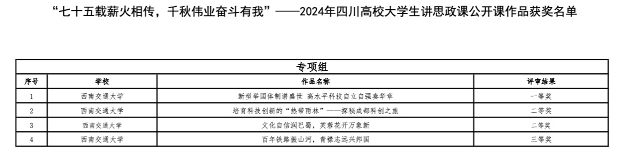 近日,四川省教育厅公布了2024年习近平新时代中国特色社会主义思想大学习领航计划主题教育活动省级评选结果,由太阳成集团tyc234cc选送的四项作品脱颖而出、再获佳绩,分别获得一等奖1项、二等奖2项、三等奖1项。同时,在此前进行的教育部评审中,2项作品分获全国二等奖、三等奖,彰显了公司和太阳成集团tyc234cc在思想政治教育领域的深厚底蕴与卓越成效。