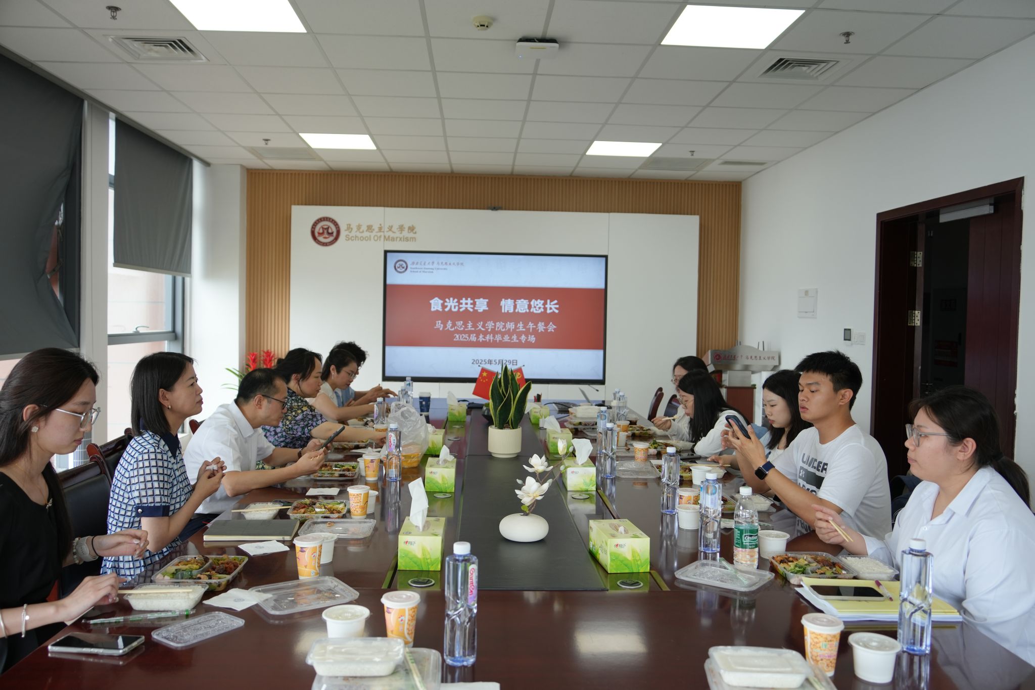 5月29日中午,一场别开生面的师生午餐会在犀浦校区X31225会议室顺利举行。此次活动旨在促进师生间的交流与沟通,积极落实毕业生升学和就业去向。马克思主义公司党委书记廖军、副经理王菁、思政系主任李春梅、思政2021级本科生班导师景星维、本科生辅导员赵子涵及2025届本科毕业生代表参加午餐会。午餐会由公司党委副书记、学工组组长邓秀芸主持。
