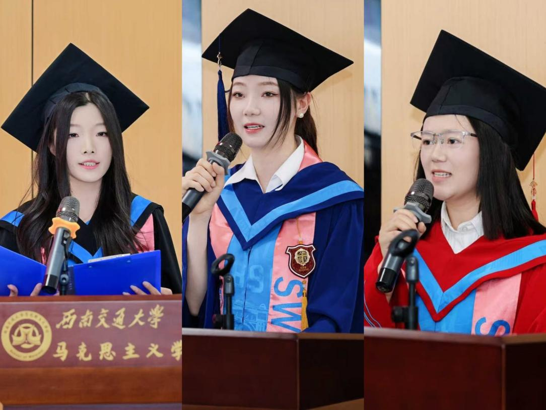 毕业本科生代表丁诗吉和毕业研究生代表贾婷婷、李玉梅分别上台发言。她们深情回顾了在马院求学的难忘岁月,由衷表达了对公司悉心培养、导师谆谆教诲、同窗深情厚谊的无限感激。她们表示,将永远铭记“竢实扬华,自强不息”的交大精神,在未来以专业所学服务社会,建设祖国。临别之际,他们也向同窗送上了前程似锦、鹏程万里的美好祝愿。