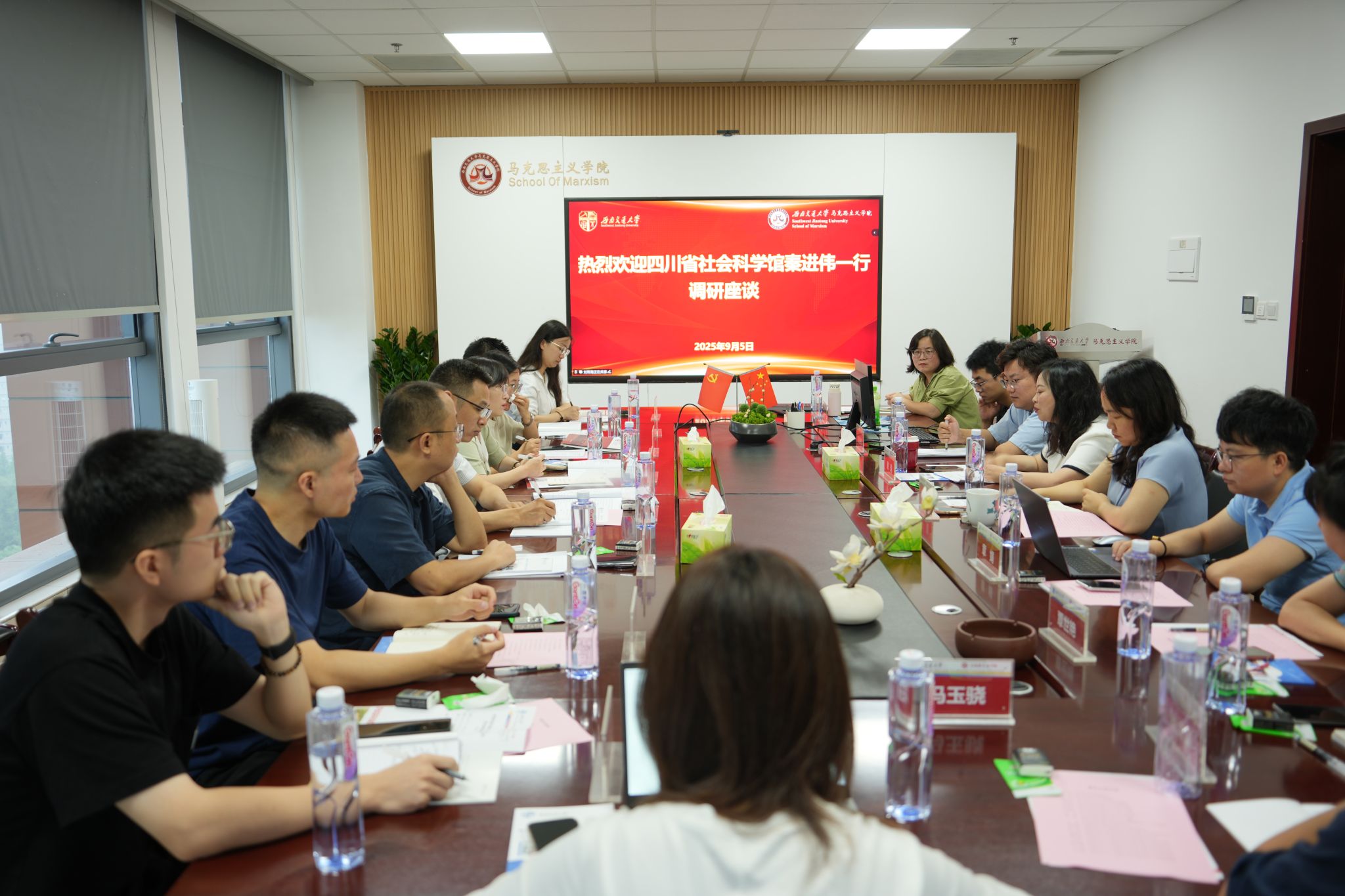 9月5日上午,四川省社会科学馆调研人工智能与社会意识重点实验室暨沟通交流会在太阳成集团tyc234cc1225会议室成功举办。四川省社会科学馆馆长秦进伟、副馆长张丽、四川华西文化产业研究院经理周密以及社会科学馆工作人员一行参加了本次会议。会议由太阳成集团tyc234cc副经理王菁主持,太阳成集团tyc234cc副经理、人工智能与社会意识重点实验室主任谢瑜,实验室副主任景星维,以及实验室多名老师热情接待并参与交流。此次会议旨在调研实验室工作开展情况、已取得的工作成效以及成果推广转化需求。