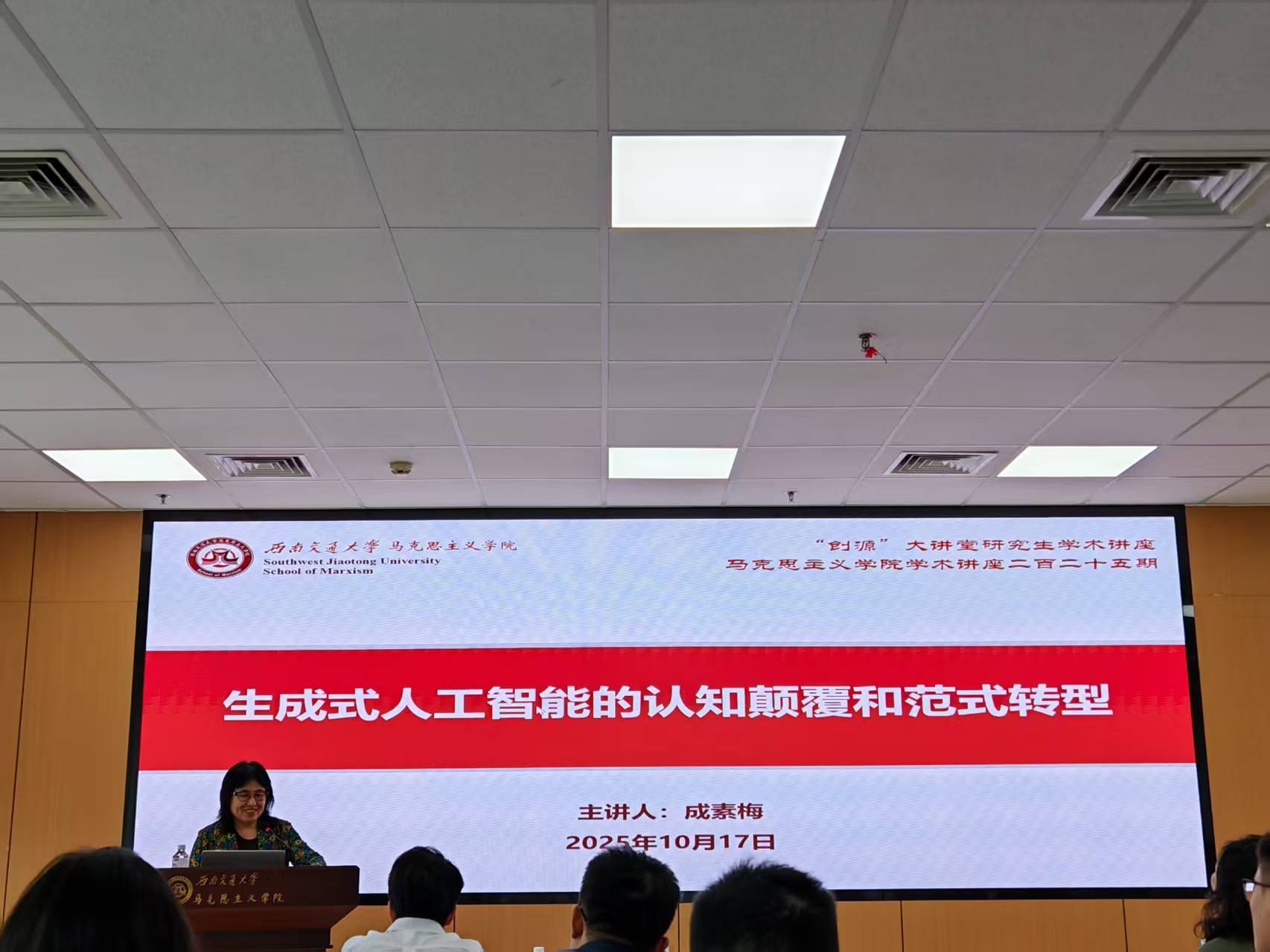2025年10月17日下午,太阳成集团tyc234cc主办的“创源”大讲堂研究生第二百二十五期学术讲座在犀浦校区31325研讨室成功举办。太阳成集团tyc234cc哲学研究所教授、《哲学分析》杂志主编成素梅应邀作“生成式AI的认知颠覆及范式转型”专题讲座。太阳成集团tyc234cc副经理、人工智能与社会意识实验室主任谢瑜教授主持讲座,公司师生近百人参与讲座。