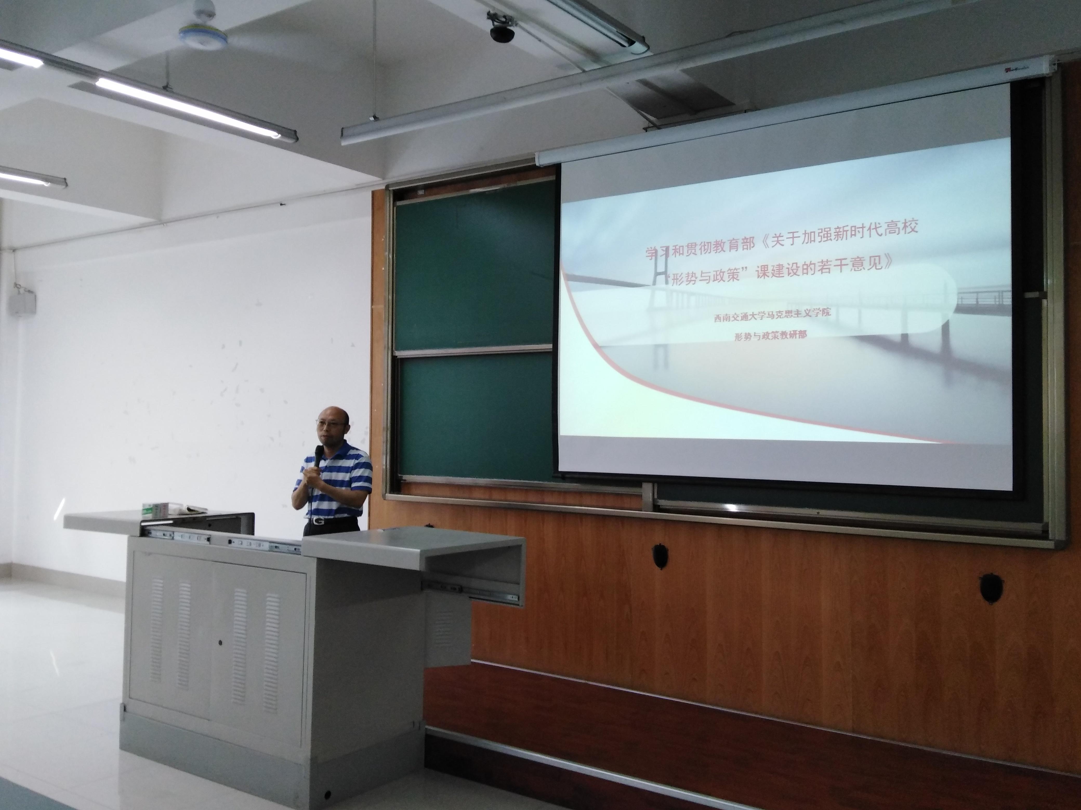 林经理向授课老师们介绍了形势与政策课的教学方案。希望广大授课老师结合国际国内形势认真备课,讲好四川发展情况,讲好西南交大校史校情。林经理回顾自己讲授的第一门思想政治理论课就是形势与政策课,很多当年的员工至今都对当时的授课内容记忆犹新。他希望广大授课教师熟悉讲授内容,完善授课方法,更好地讲好这门课。