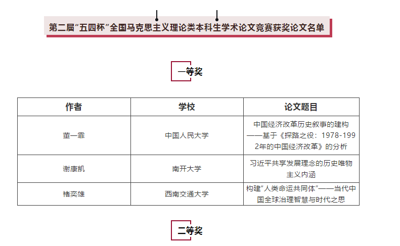 近日,公司思想政治教育专业2018级本科生褚奕雄同学获得由教育部高等公司马克思主义理论类专业教学指导委员会主办、中国人民大学承办的第二届“五四杯”全国高校马克思主义理论类本科生学术论文竞赛一等奖。褚奕雄同学已连续两年获得该奖项。