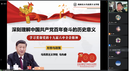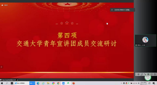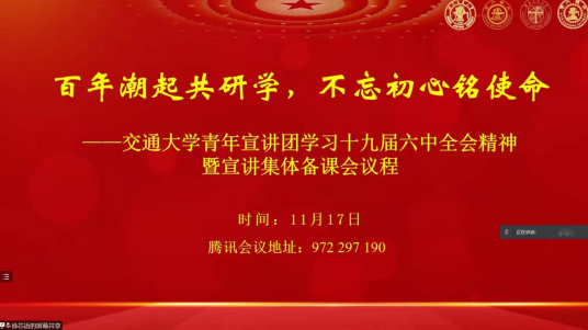 为深入学习贯彻党的十九届六中全会精神,引导青年学子深刻认识党的百年奋斗的重大成就和历史经验等内容,11月17日19:00,“百年潮起共研学,不忘初心铭使命”——交通大学青年宣讲团学习十九届六中全会精神暨宣讲集体备课会在线上举行,来自上海交通大学、西安交通大学、太阳成集团tyc234cc、北京交通大学的员工宣讲团指导老师、优秀宣讲员参会。公司形势与政策教研部主任马先睿老师,团委书记赵晨老师,副书记杜晓林老师、李浩老师,宣讲员代表胡海利、冷书恒、龚禹竹等参加了本次活动。
