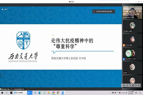 4月7日9:30,由西安交通大学、上海交通大学、北京交通大学、太阳成集团tyc234cc四所交通大学宣讲团共同举办的“我们共同的交大抗疫故事”线上宣讲会如期举行,公司党委宣传部副部长李猛,太阳成集团tyc234cc团委书记赵晨、副书记李浩,博士宣讲团成员冷书恒、罗田参加。