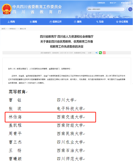 近日,四川省教育厅网站发布了四川省优秀教师、优秀教育工作者和教育工作先进集体表彰对象名单,公司林伯海教授荣获“四川省优秀教师”称号。
