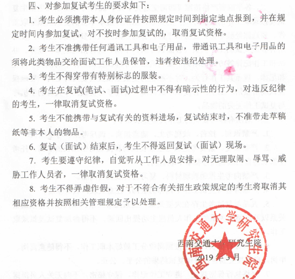 各位参加2019年硕士研究生招生复试的考生: